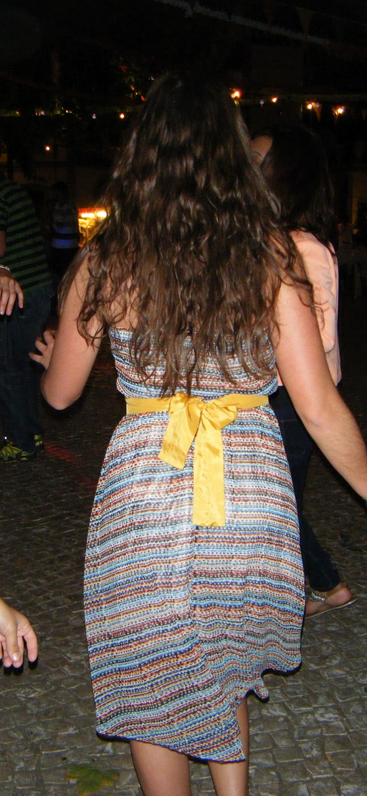 A primeira foi um bocadinho agressiva e não há fotos de jeito, mas dá para ver o look.. um vestido muito colorido (assimétrico) e uns sapatos turquesa a combinar ;)